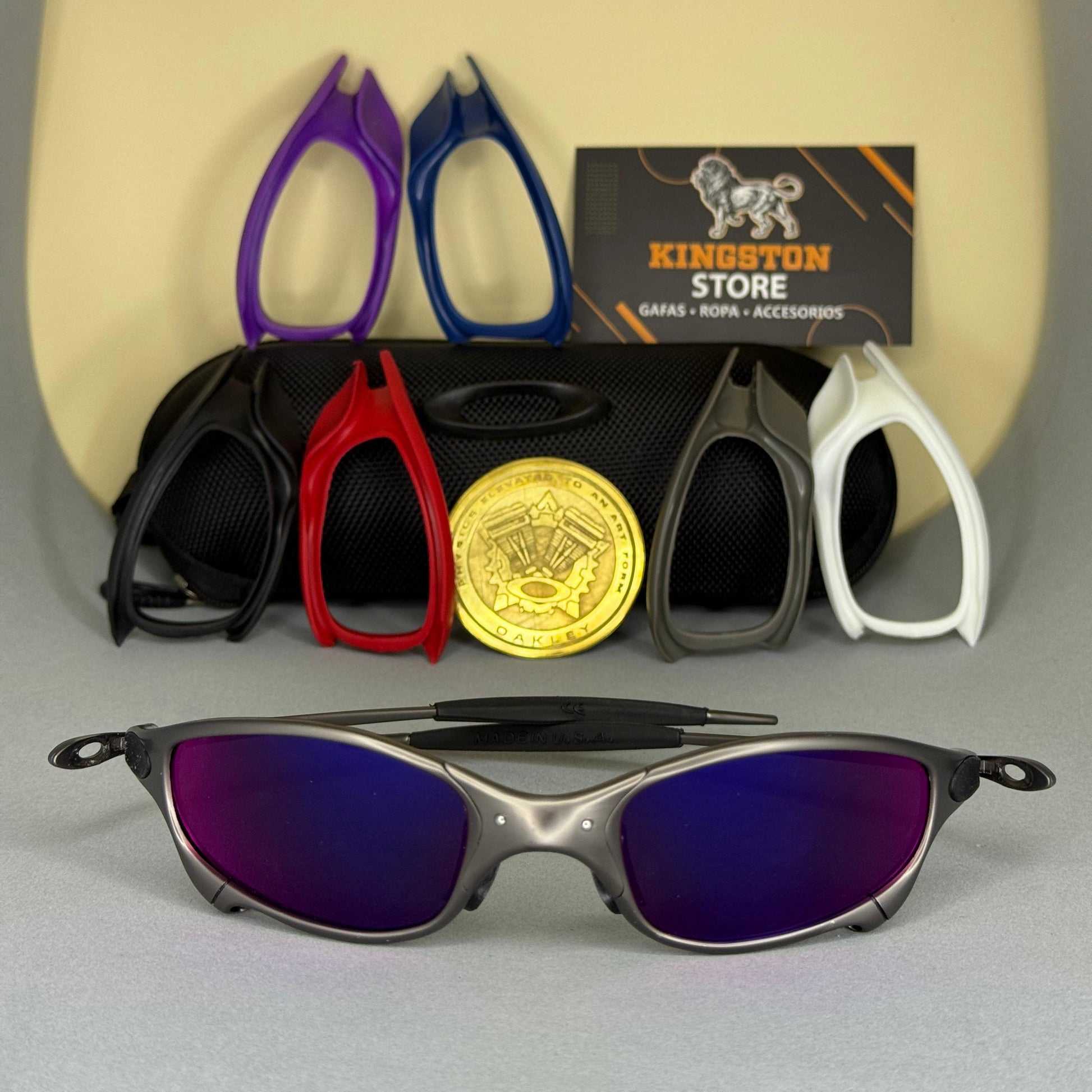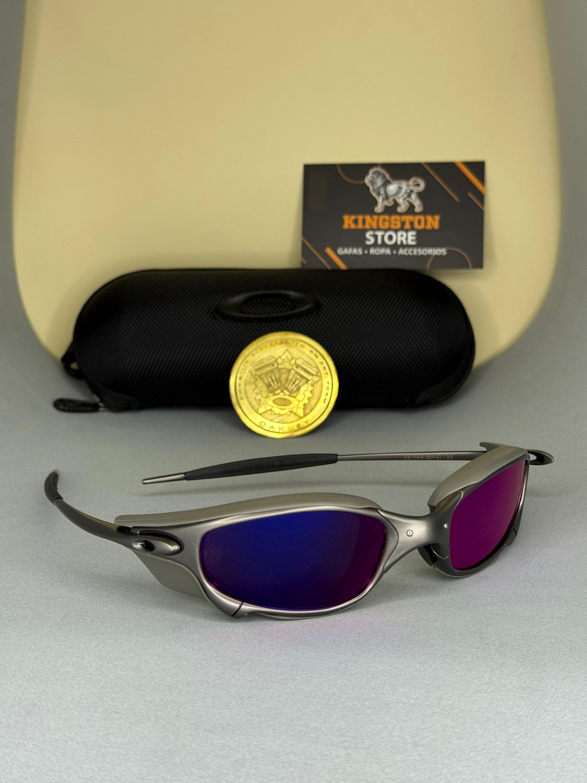Las Juliet Platino con lentes tanzanite + sideblinders gris. Full Metal destacan por su estructura metálica robusta y elegante, con un acabado que resalta su carácter exclusivo. Sus lentes polarizados ofrecen una visión nítida y protegida contra reflejos, brindando comodidad en cada uso.