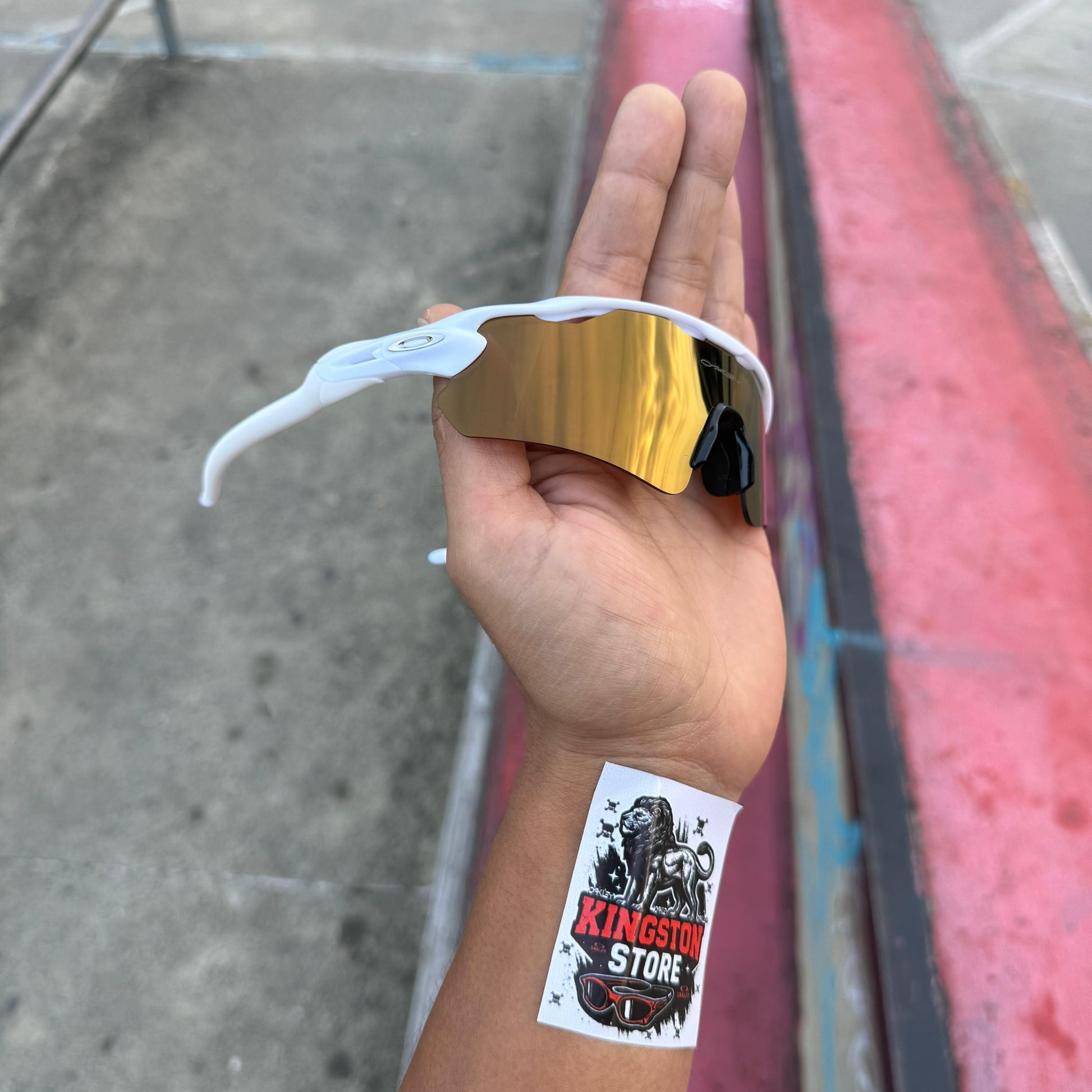 Radar con marco blanco y lente dorado destacan por su diseño deportivo y moderno, combinando ligereza con una resistencia increíble. Sus lentes ofrecen protección total y una visión nítida, perfectas para entrenar o para usar a diario con un look fresco y único.